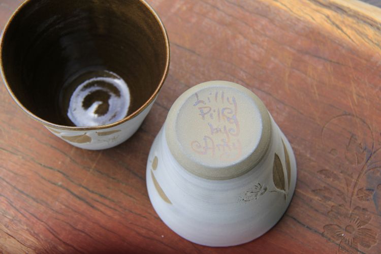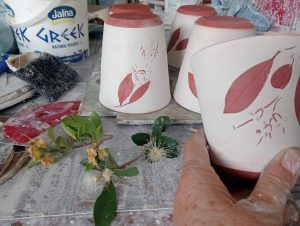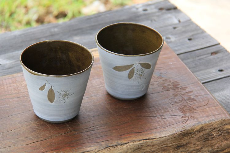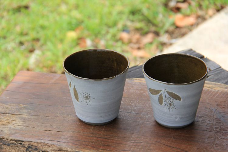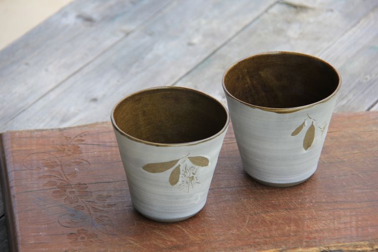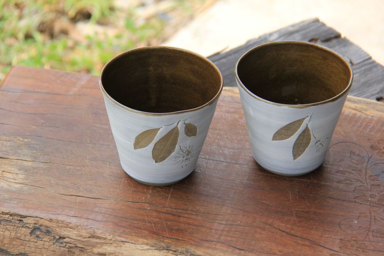 Perfect for cupping an icy drink on a sweltering day these beakers feature imprinted lilly pilly leaves and sgraffito decoration.